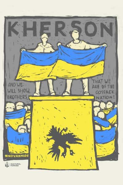 "У муралі в Сумах я «відродив» зруйнований монумент Тарасові Шевченку авторства Івана Кавалерідзе. Конотоп — це образ української жінки у світшоті, чий декор наслідує орнаментику ікон Сорочинського іконостасу. Полум’я з бандера-смузі відсилає до козаків, які розбили московитів під час Конотопської битви 1659 року. Херсон відображає малюнок, створений на основі історичної світлини 2022 року, на котрій двоє херсонських юнаків тримають українські прапори на постаменті в день визволення міста. Розкидані внизу картини — згадка про викрадення окупантами колекції Херсонського художнього музею", – розповів художник.