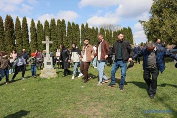Тим часом 77-річний Іван Іванович починає вести танок. Чоловіки, взявшись за руки, рухаються з ритмічними кроками навколо церкви.