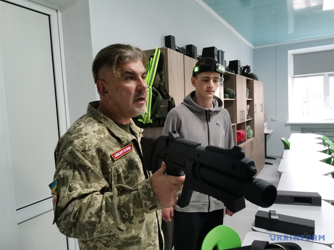 – Це зброя, з якою ми вивчаємо тактику. Ділимося на команди, далі – на групи. Потім налаштовуємо нашу лазерну зброю: скільки там буде набоїв, уражень. Коли в тебе влучають, це фіксує індикатор. Під час гри виконуємо завдання командира, як у реальному бою. Є точка, до якої твоя команда має дійти першою, щоб перемогти. І бажано, щоб без втрат, – пояснює юнак.