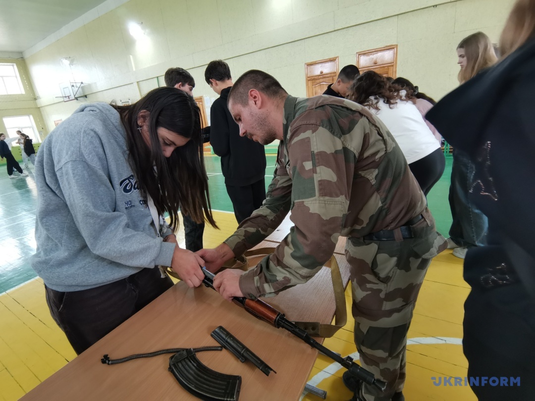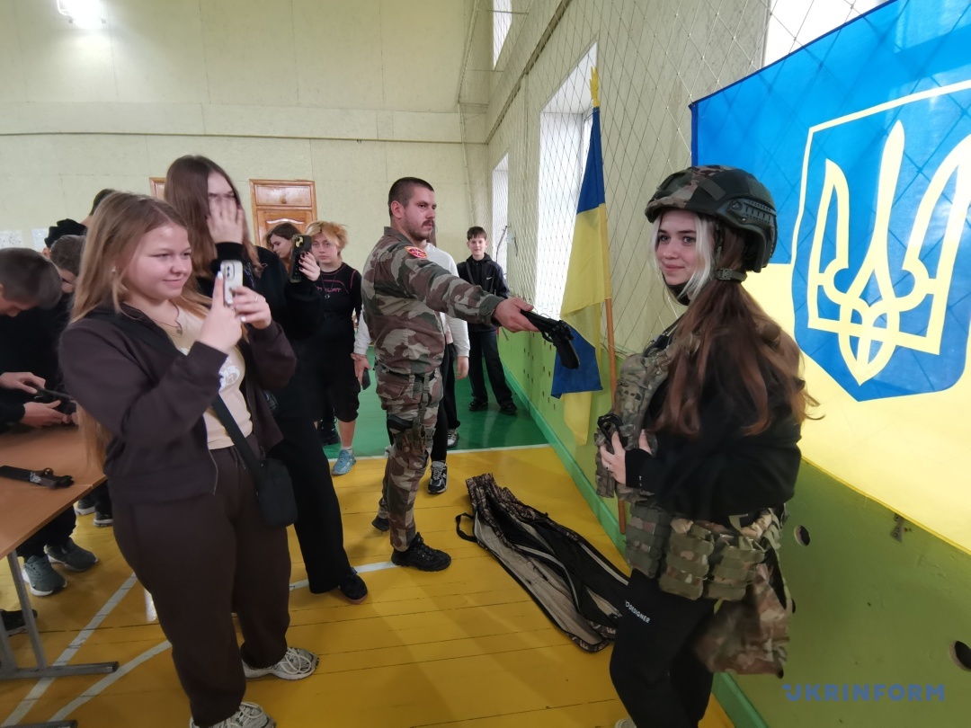 В іншій локації школярі вивчають правила поводження зі стрілецькою зброєю та намагаються збирати й розбирати розкладені на столі автомати. Поруч – військова амуніція бійців. Офіцер-інструктор Ярослав Яковенко допомагає дівчаткам приміряти її на себе, – хочуть зробити фотографію на аватарку в соціальних мережах. Ну, що ж, нехай у такий спосіб, але це також можливість ознайомитися з обладунками та відчути їхню вагу. Та й світлина та буде не з надутими губками, а на тлі державного прапора.