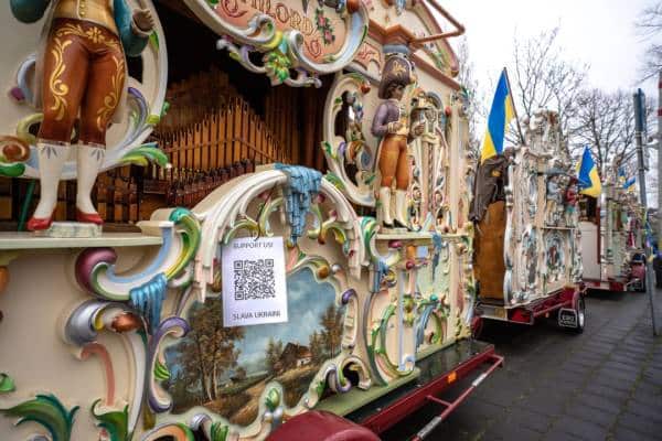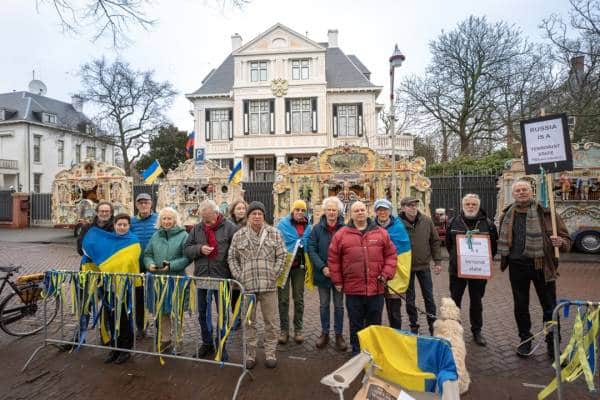 Нідерландці влаштували під посольством Росії в Гаазі звукову акцію протесту Фото 25.02.2026 03:50 Укрінформ Під посольством Росії в Гаазі нідерландці вчетверте поспіль провели звукову акцію протесту, цього року одразу з чотирьох нідерландських традиційних вуличних органів гучно лунав гімн України, навпроти будівлі розгорнули двадцятиметровий український стяг.