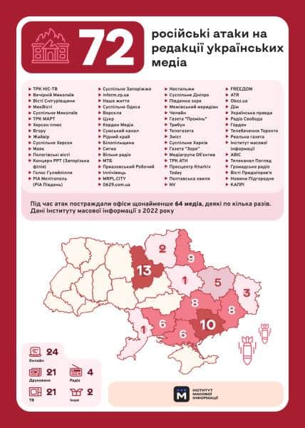 Крім того, ІМІ зафіксував щонайменше 24 публічно відомі атаки Росії на українські телевежі та іншу телевізійну інфраструктуру у 12 регіонах України. Найбільше таких випадків – у Харківській, Сумській і Херсонській областях. Також удари по цивільній телеінфраструктурі фіксували у Дніпропетровській, Запорізькій, Київській, Чернігівській, Донецькій, Луганській, Вінницькій, Житомирській і Рівненській областях.