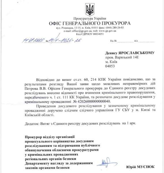 "З 14 січня 2026 року стосовно Петрова порушена кримінальна справа СБУ за ч.1 ст. 111 Кримінального кодексу – це державна зрада)", – зазначив Железняк.