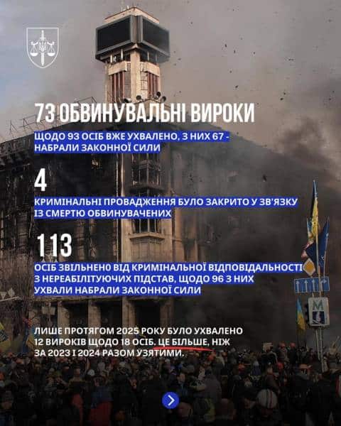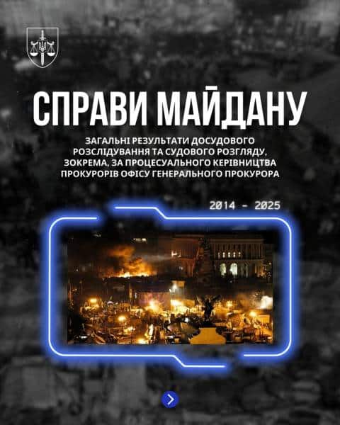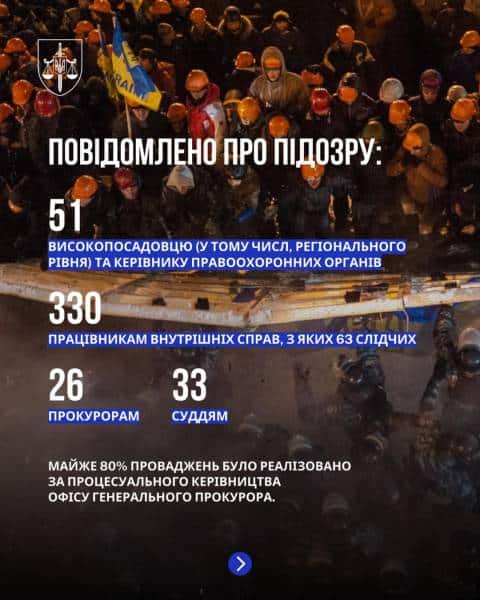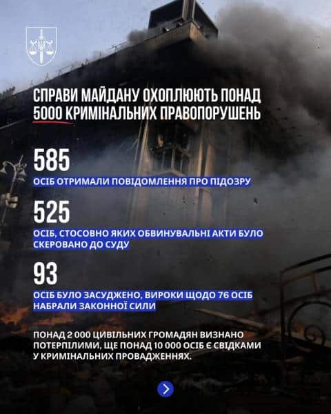 «Справи Майдану» охоплюють понад 5000 кримінальних правопорушень Інфографіка 20.02.2026 15:50 Укрінформ "Справи Майдану" охоплюють понад 5000 кримінальних правопорушень, підозру отримали 585 осіб, зокрема 52 високопосадовець.