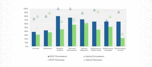 У впровадженні регуляторних (80%) та імплементаційних (89%) критеріїв у сфері лобіювання Україна є одним із лідерів поряд з Канадою, Францією та Естонією. Українське законодавство, на відміну від більшості країн-членів та країн-партнерів ОЕСР, передбачає прозорість інформації про бенефіціарних власників, санкції за порушення правил лобістської діяльності, а Реєстр прозорості містить найповніший набір даних про суб’єктів лобіювання, їх діяльність та витрати (аналогічна ситуація лише в Румунії).