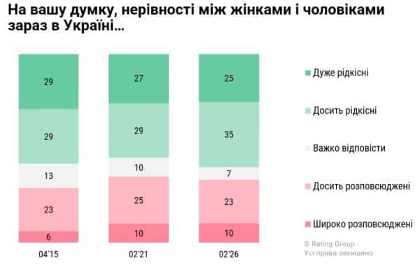 ‍При цьому більшість опитаних вважають нерівність рідкісним явищем в Україні, але особливих змін за останні понад десять років опитування не зафіксувало. «60% респондентів кажуть, що нерівність між чоловіками й жінками – це загалом рідкісне явище в Україні. Протилежної думки – третина респондентів, ще 7% – вагаються. Значних коливань у сприйнятті цього питання за останнє десятиліття ми не фіксуємо. Проте песимізм помітно виріс у молодих чоловіків віком 18-35. Якщо в 2021 році про розповсюдженість нерівності казали 30%, то нині – 41%. Натомість серед жінок 18-35 навпаки зріс оптимізм: у 2021 році 42% респонденток з цієї категорії вважали, що нерівність є розповсюдженою, а зараз – близько третини», – йдеться у повідомленні.