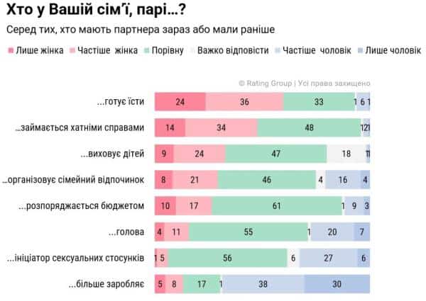 ‍Найчастіше порівну розподіляється розпоряджання бюджетом (61%), ініціювання сексуальних стосунків (56%), керування родиною (55%), обов’язки з виховання дітей (48%) й організація відпочинку (46%).