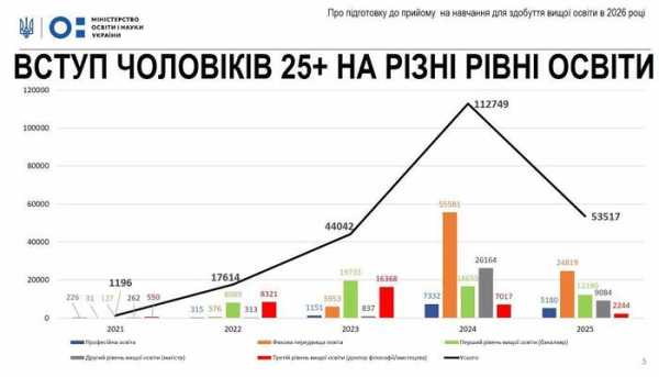 Зокрема, статистичні дані вступу свідчать, що на всі рівні освіти у 2025 році вступили 53,5 тисячі чоловіків 25+, що значно менше у порівнянні з 2024 роком, коли таких вступників було майже 113 тисяч.